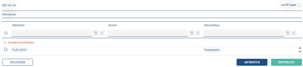 "Zum Projekt" öffnet die Projektansicht und Markiert die in der Benachrichtigung ggf. genannte Unterlage in der Dokumenteübersicht.