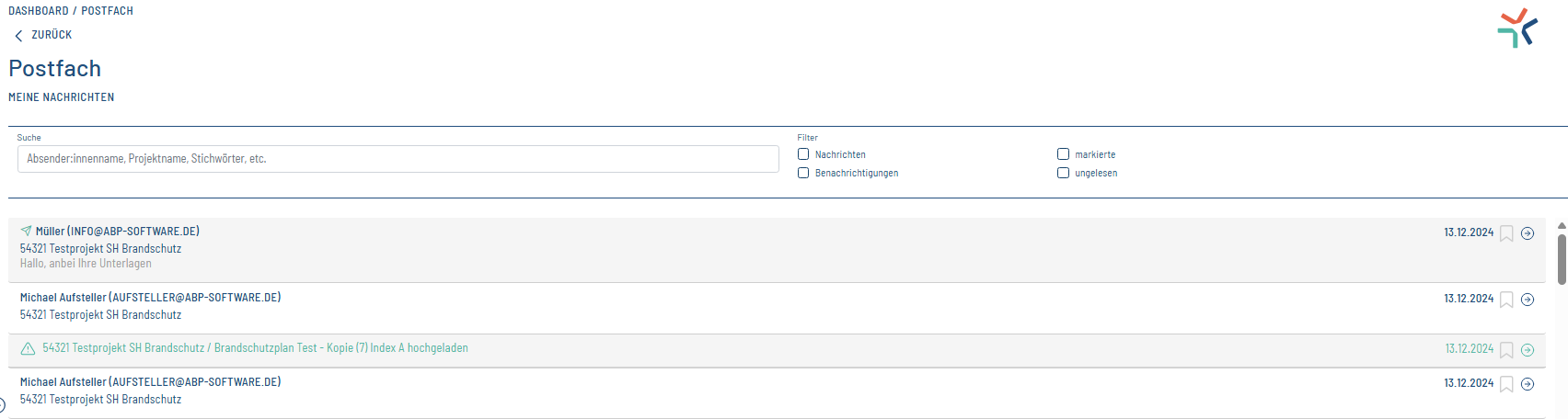 Über die Suchzeile und Filter kann die Ansicht begrenzt werden, mit dem Pfeil rechts können die Nachrichtendetails abgerufen werden. Ein roter Punkt signalisiert ungelesene Nachrichten.