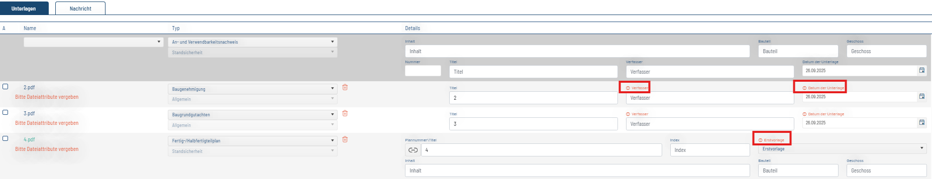 Es ist nach wie vor möglich über die erste Zeile (grau) die Dokument-Attribute für den ganzen Uploadstapel zu vergeben.