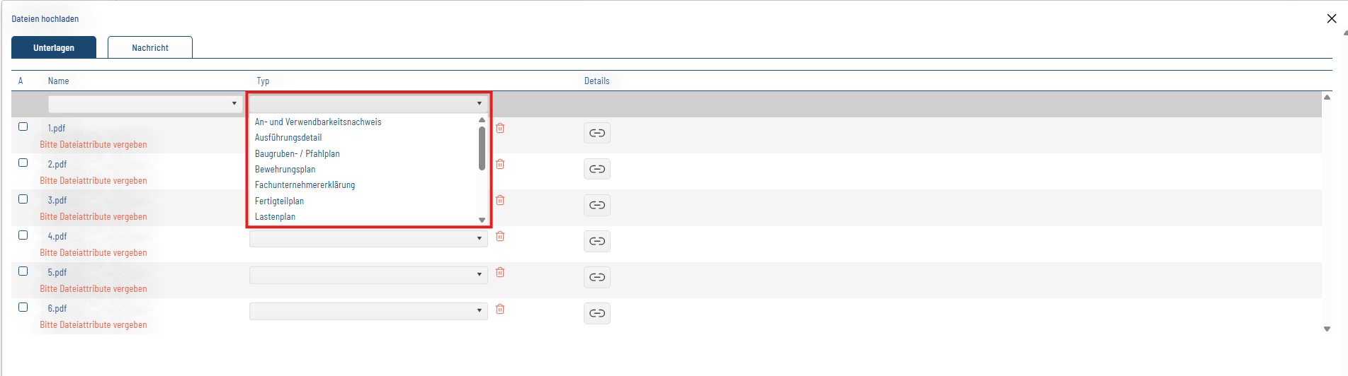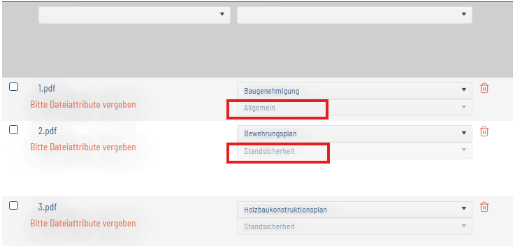 Indexierungen auf bereits hochgeladenen bautechnische Unterlagen sind mit dem Büroklammersymbol möglich